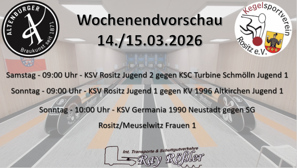 Die Winterferien sind vorbei. Die Spielbetrieb steht vor der Tür. Am Samstagmorgen geht es für unsere Handicap-Kegler nach Saalfeld. Auch unsere 3.Mixed und 2.Männermannschaft sind im Laufe des Tages in Auswärtsspielen gefordert. Am Sonntagmorgen trifft unsere 1.Frauenmannschaft im Heimspiel auf… Weiterlesen →