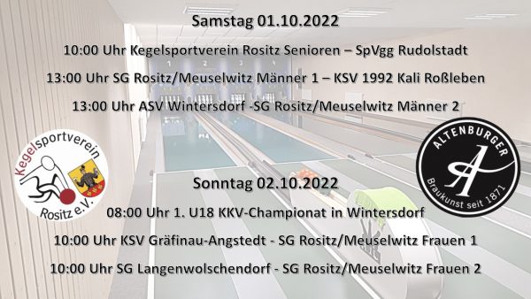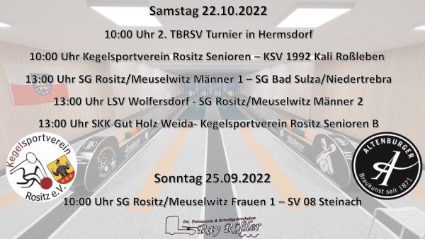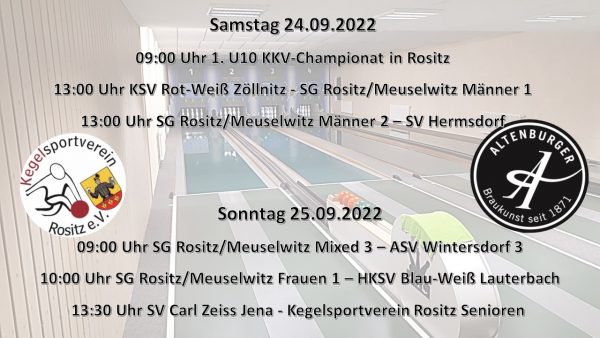SG Rositz/Meuselwitz Männer 1 – KSC Turbine Schmölln 5 : 3 Unsere Männer machten es gegen Schmölln wieder spannend. Mit 29 Holz Vorsprung gewinnen sie gegen starke Gäste aus Schmölln. Bester Spieler war René Krüger mit 587 Kegeln. Kegelsportverein Rositz… Weiterlesen →