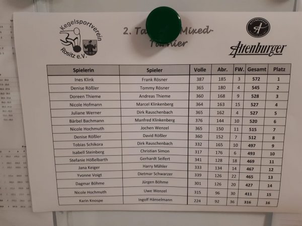 Am vergangenen Samstag fand die 2. Ausgabe unseres Tandem-Mixed-Turniers statt. Es fanden sich wieder 16 Paare auf unserer Kegelbahn ein um einen gemütlichen Nachmittag und Abend zu verbringen und am Ende auch die Sieger zu kühren. Dabei war die jüngste… Weiterlesen →
