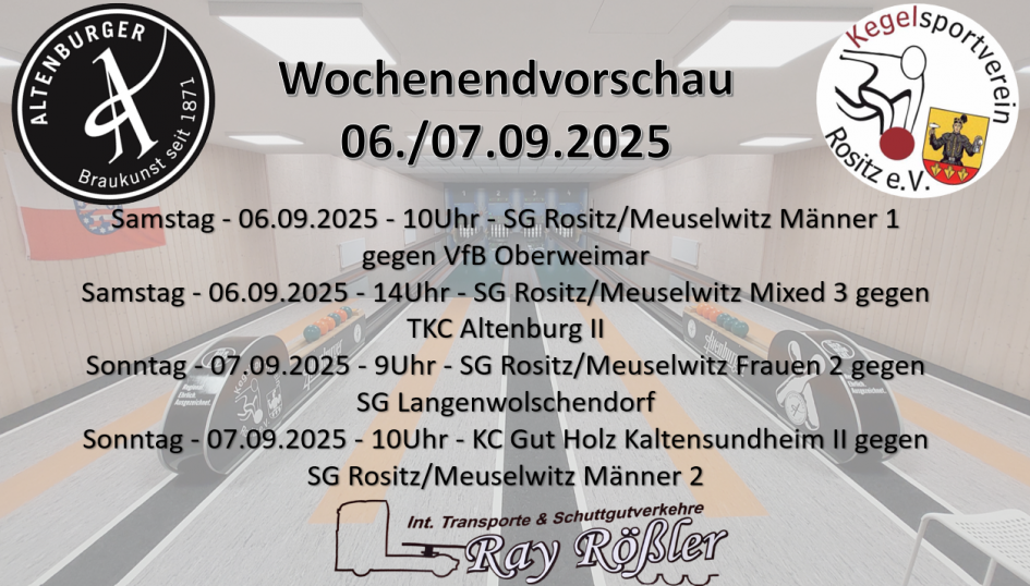 Die Saison 2025/2026 startet. Am Start sind Samstag unsere 1.Männermannschaft zuhause gegen Oberweimar und unsere 3. Mixed-Mannschaft ebenfalls im Heimspiel gegen Altenburg. Sonntagmorgen folgen die 2.Frauenmannschaft auf unseren Bahnen gegen Langenwolschendorf und unsere 2.Männer in Kaltensundheim.