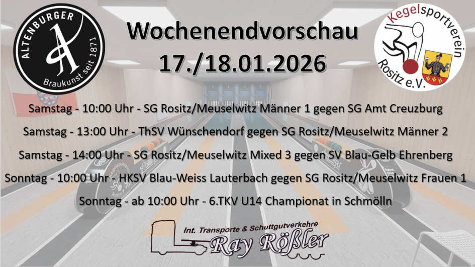 Wir wünschen allen Kegler/innen Gut Holz und viel Spaß. Für alle Auswärtsspiele – Gute Fahrt! Habt ein schönes Wochenende!