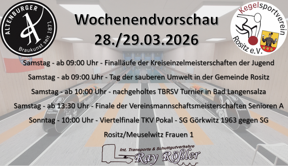 Ebenfalls am Vormittag starten unsere Handicap-Sportler ihr Nachholturnier in Bad Langensalza. Samstagmittag geht es für einige Rositzer Senioren mit der KKV-Auswahl zum Finale in Zeulenroda.