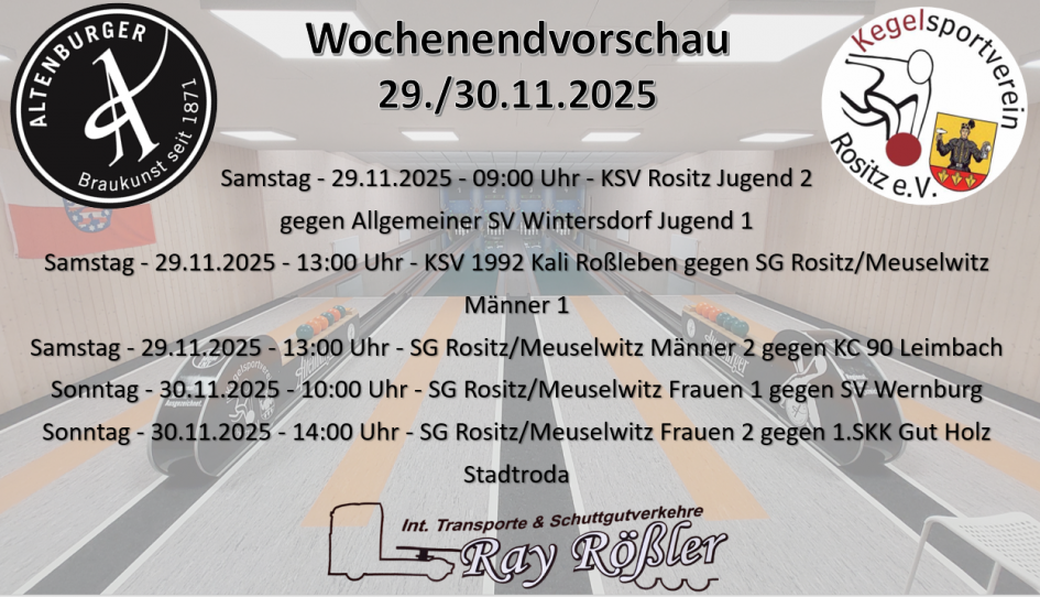 Sonntag – 30.11.2025 – 14:00 Uhr – SG Rositz/Meuselwitz Frauen 2 gegen 1.SKK Gut Holz Stadtroda